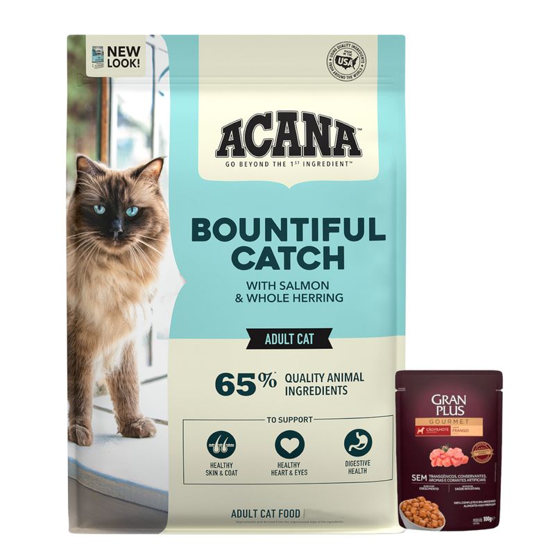 ACANA Bountiful Catch contiene un 65% de ingredientes de origen animal de gran calidad como el salmón, el bagre y el arenque entero. Nunca se agrega ningún color, sabor o preservante artificial.