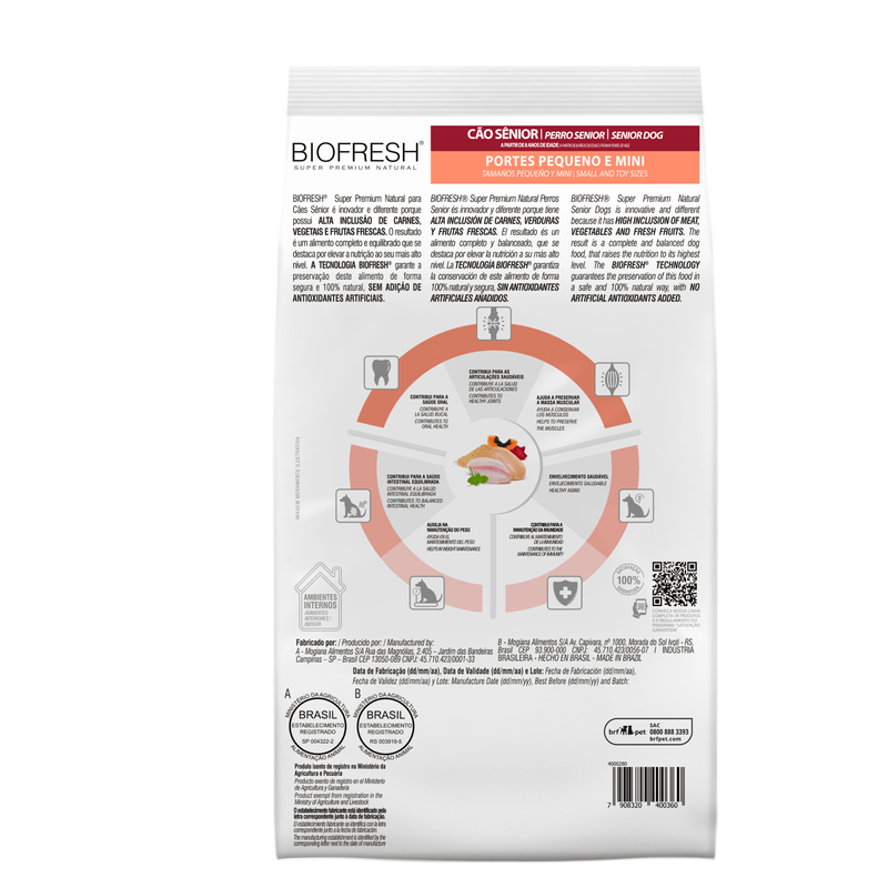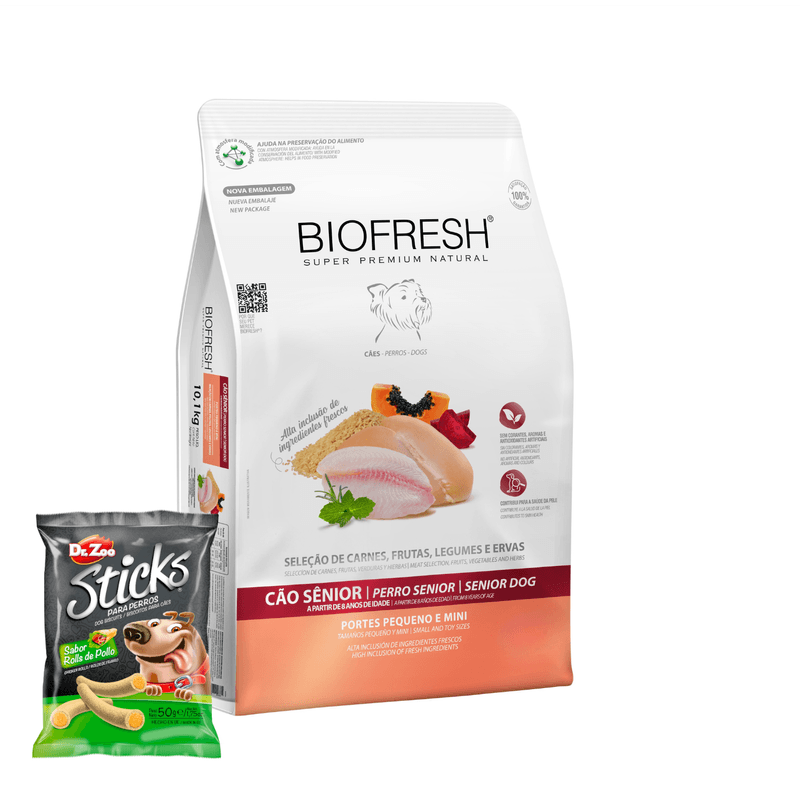 Biofresh Super Premium Senior: Nutrición Óptima para Perros Mayores de Razas PequeñasInnovación y Frescura Natural:Biofresh Super Premium Senior se destaca por su alta inclusión de ingredientes frescos y naturales, directamente de la naturaleza. Este alimento completo y equilibrado está diseñado para satisfacer las necesidades nutricionales de perros mayores de razas pequeñas, ayudando a preservar su vitalidad y salud. La tecnología Biofresh garantiza la conservación natural y segura del alimento, sin conservantes artificiales.