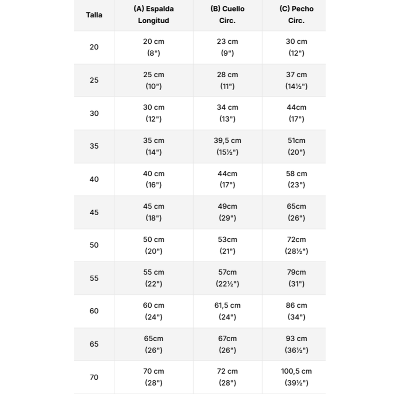 - 50 cm: Espalda 50 cm, cuello 53 cm, pecho 72 cm