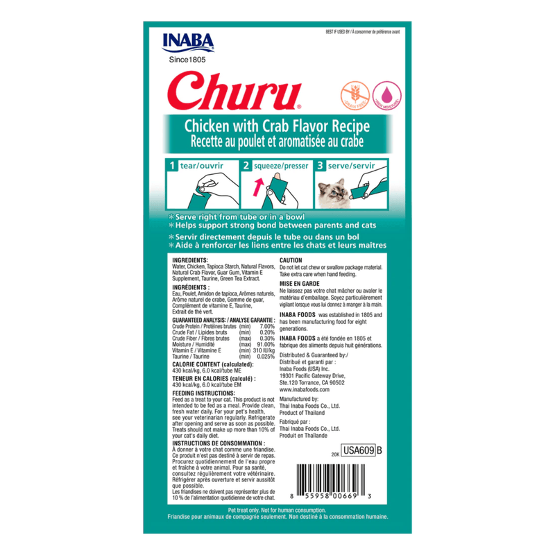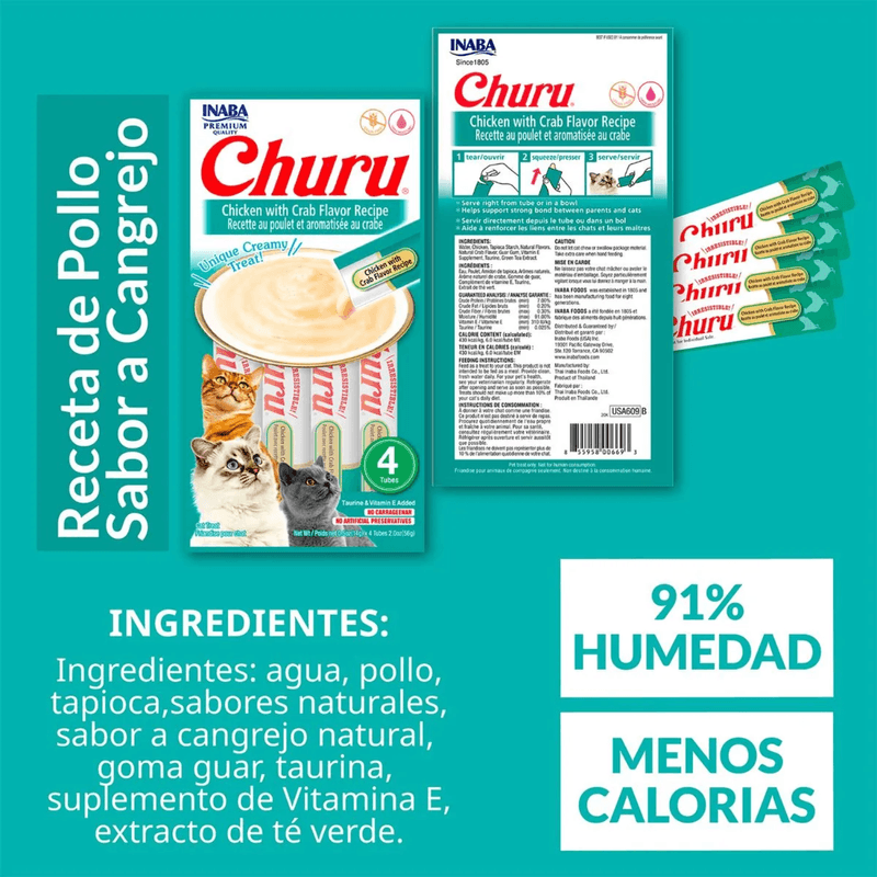 Churu® sabor Pollo con Cangrejo es un snack cremoso, natural y delicioso, ideal para gatos de todas las edades. Elaborado con