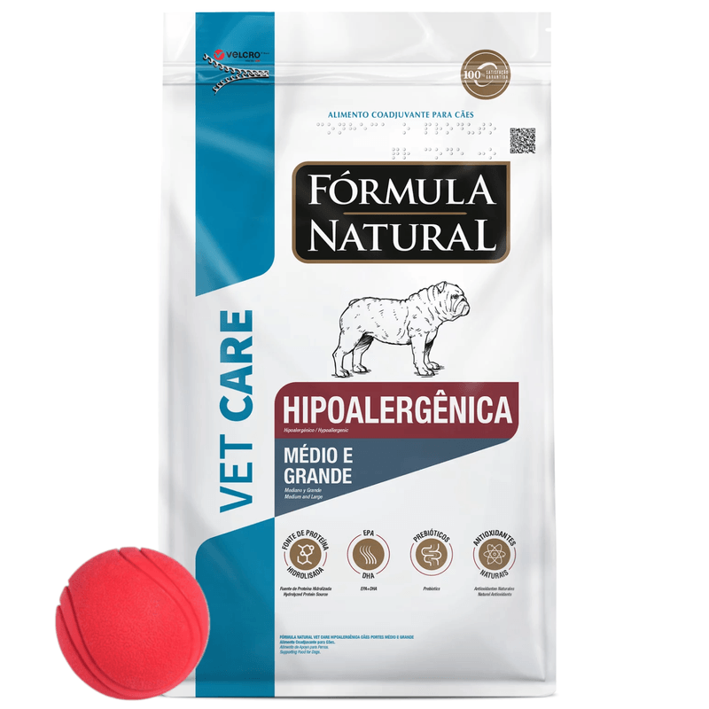 Natural Vet Care Fórmula Hipoalergénica para Perros Medianos y Grandes es un alim!ento complementario indicado para ayudar a tratar reacciones adversas a los alimentos, como hipersensibilidad e intolerancia alimentaria a ciertos ingredientes en los perros. En caso de reacciones adversas a los alimentos, incluyendo hipersensibilidad e intolerancia alimentaria, es fundamental sustituir la dieta por un alimento con menor potencial de provocar síntomas dermatológicos y/o gastrointestinales.