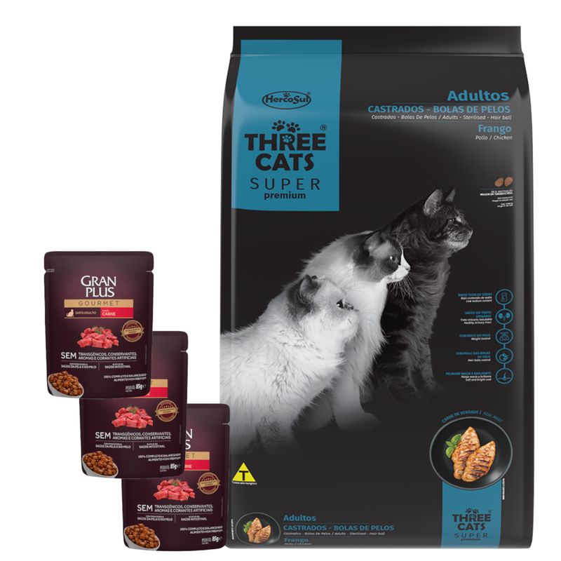 - 10%Three Cats Super Premium - Gato Castrado y Bola de Pelo (Pollo) - 10,1 Kg + Regalo! 10,1 Kg$ 2.990,00De$ 2.990,00Para$ 2.691,00O 12 x de $ 224,25sin interesesCantidad+-10.000 disponiblesAgregar al carrito