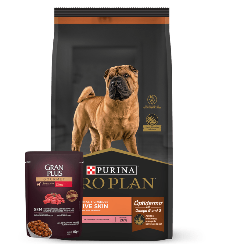 Pro Plan Adult Sensitive Skin (Pieles Sensibles) con OptiDerma formulado por veterinarios y nutricionistas para satisfacer las necesidades específicas de perros adultos con piel sensible. Dieta de alta tolerancia con ingredientes que comúnmente no son alergénicos.