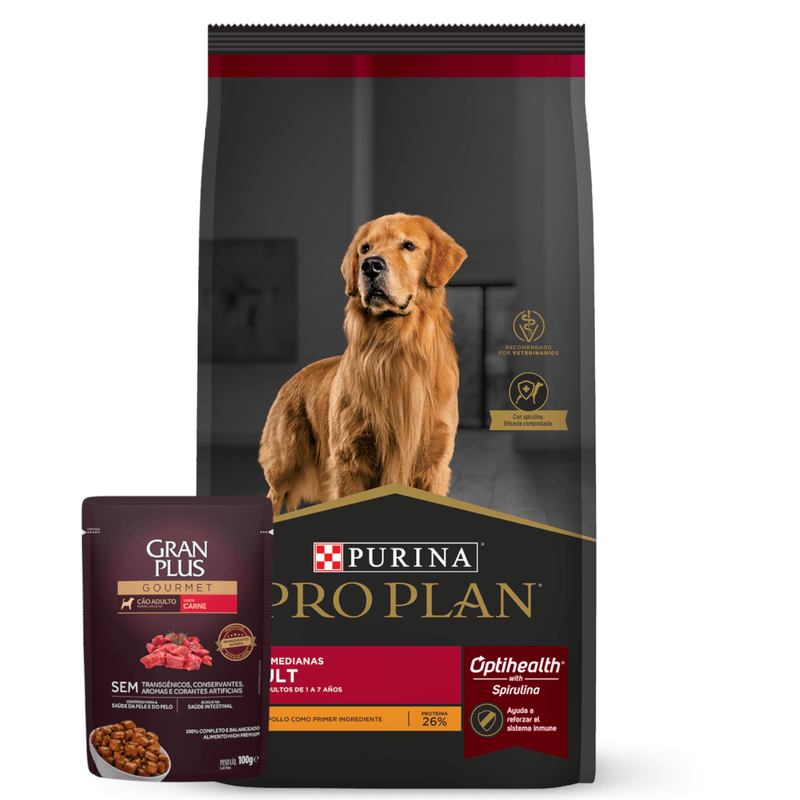Pro Plan Adult Razas Medianas está formulado por veterinarios y nutricionistas para atender las necesidades nutricionales de los perros adultos de razas medianas. Para cumplir con las exigencias metabólicas de la mayoría de los perros adultos, PURINA® PRO PLAN® ha desarrollado OptiLife® Complete. Esta fórmula ofrece, a través de sus sabrosas croquetas, un contenido rico en proteínas (26%) y grasas (15%), utilizando como ingrediente principal carne fresca de pollo, que ayuda a los perros a mantener la masa corporal magra y músculos fuertes. Al igual que todos los cachorros, tras el destete experimentarán una "brecha inmunológica” que los dejará en condiciones vulnerables. Incluye también una proporción balanceada de calcio y fósforo que mantiene los huesos fuertes y los dientes sanos. Además, esta fórmula contiene OptiLife® Triple Action, una combinación única de nutrientes que refuerza la salud de tu perro de tres formas esenciales, ayudándolos a alcanzar su máximo potencial.
