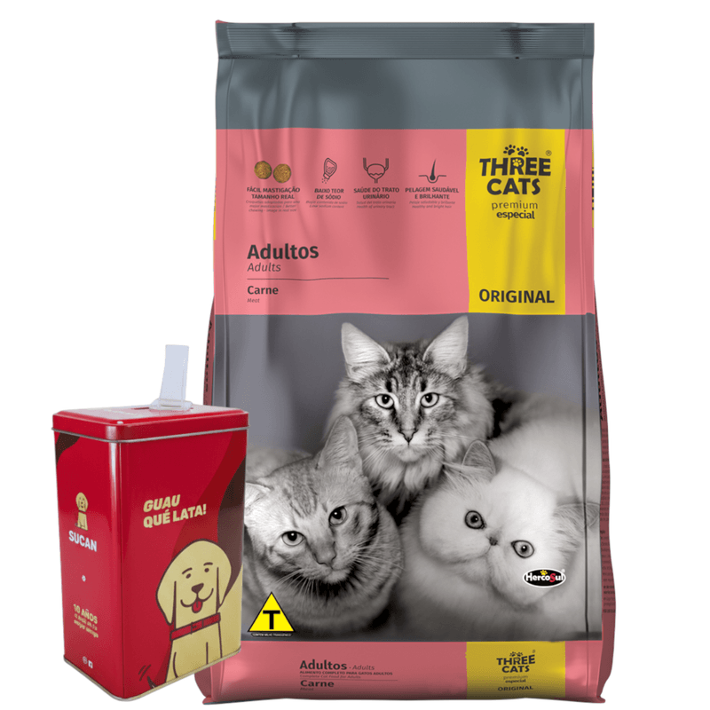 Three Cats Premium Especial Original Adultos es un alimento moderno y seguro, libre de colorantes y aromas artificiales. Su receta es rica en ingredientes de alta calidad que suministran todos los nutrientes necesarios de forma equilibrada, de la manera que su gato necesita para tener una vida feliz y sana. Ingredientes: Harina de carne y huesos bovina, harina de carne y huesos de cerdos, harina de subproductos de pollo, hidrolizado de hígado de pollo y cerdo, arroz quebrado, gluten de maíz 60, maíz integral molido, salvado de trigo, grasa animal estabilizada, aceite de pescado, cloruro sódico (sal común), taurina, levadura de cerveza, extracto de yucca, cloruro potásico, L-lisina, cloruro de colina, acido fosfórico, antioxidantes (BHA/ BHT), vitaminas (A, B1, B2, B6, B12, D3, E, K3, niacina, ácido pantoténico, ácido fólico y biotina) y minerales (zinc orgánico, selenio orgánico, iodato de cálcio, selenito sódico, sulfato de cobre, sulfato de manganeso, sulfato de zinc, sulfato de hierro). Eventuales substitutos: Sorgo y Trigo. BENEFICIOS: Heces firmes y de bajo olor|Cero colorantes y aromas artificiales|Bajo contenido de sodio|Tracto urinario saludable|Pelaje suave y brillante