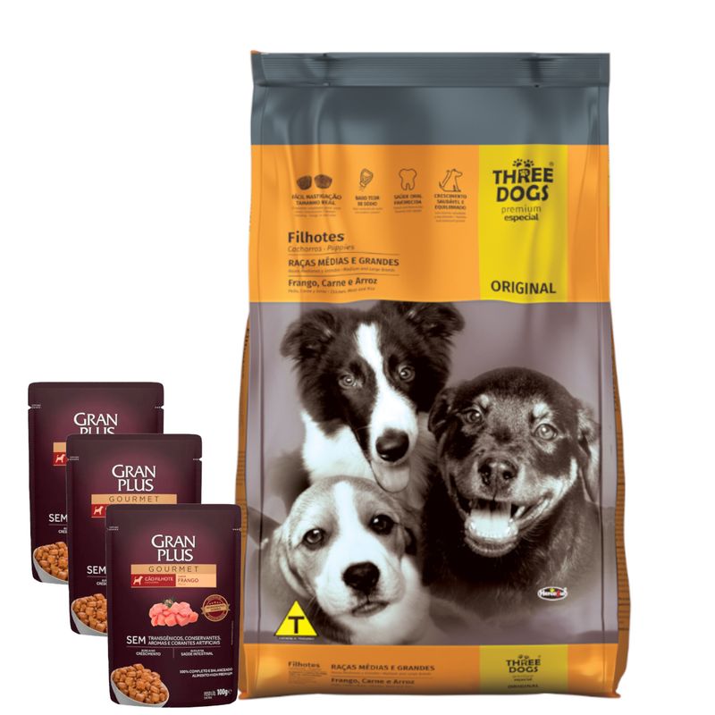 Three Dogs Premium Especial Original Cachorros de Razas Medianas y Grandes es un alimento moderno y seguro, libre de colorantes y aromatizantes artificiales que presenta un óptimo costo beneficio. Su receta es rica en ingredientes de alta calidad que proporcionan proteínas, energía, vitaminas y minerales balanceados. También es indicado para hembras a partir de la sexta semana de gestación hasta el destete total de los cachorros.